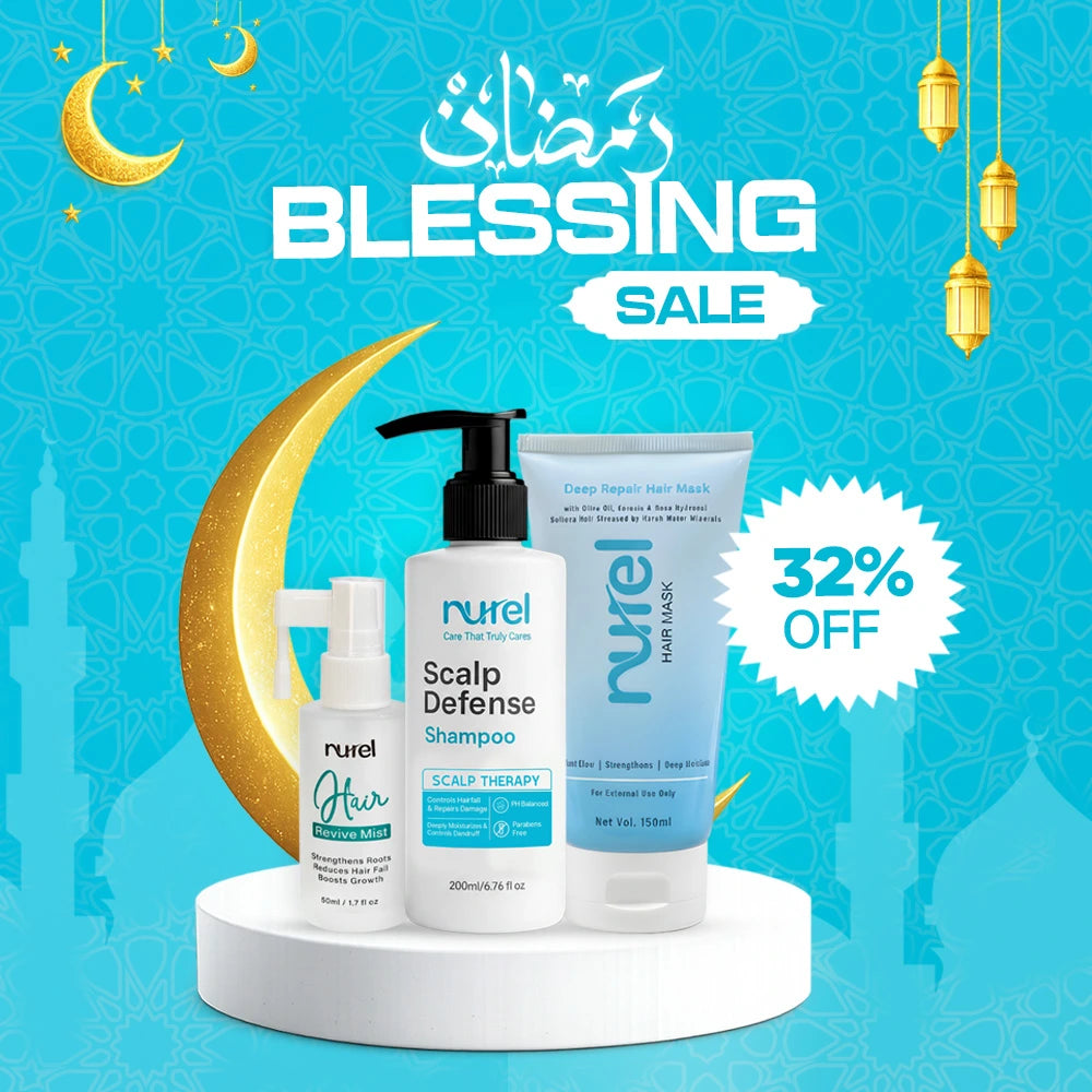 Achieve complete hair transformation with our Nurel Hair Repair & Regrowth Trio, specially formulated for stopping hair fall, repairing damage, and boosting new growth. This ultimate kit includes our Scalp Defense Shampoo, Deep Repair Hair Mask, and Hair Revive Mist. The shampoo cleanses the scalp to fight hairfall; the mask deeply repairs dryness and breakage; and the mist activates roots to boost new, healthy hair growth.