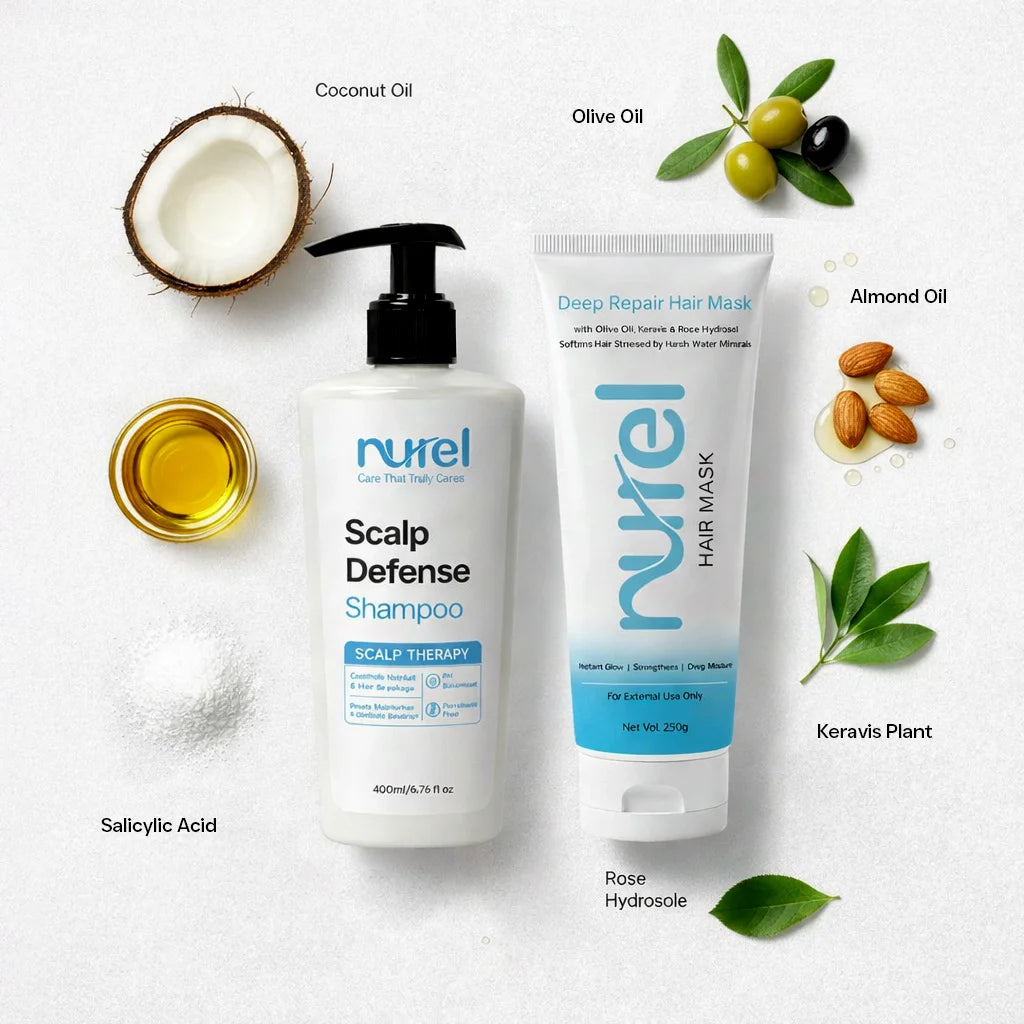 This is your dual-action solution. Our Scalp Defense Shampoo purges buildup and stops hair fall at the root, while our Deep Repair Hair Mask injects deep hydration to reverse dryness, repair damage, and give you instant softness.
